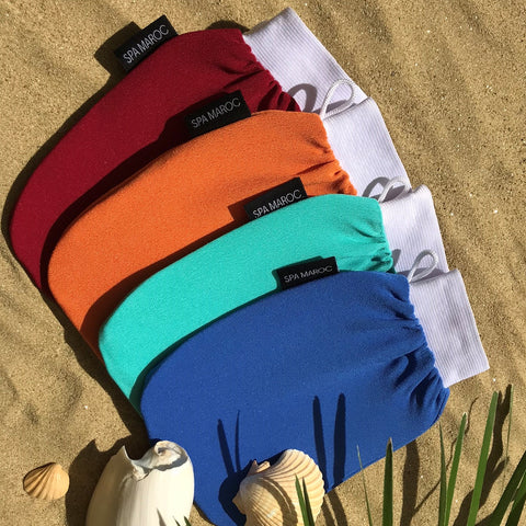 Die türkischen Peeling-Handschuhe, bekannt als Kese, sind oft aus Seide oder Leinen gefertigt und meistens feiner. Sie haben ein Band, das man um das Handgelenk wickelt, um sie zu fixieren, es gibt aber auch zunehmend Modelle mit einem Gummiband. Marokkanische Peeling-Handschuhe werden als Kessa, Kissa oder Kiss bezeichnet. Die nach Europa oder Saudi-Arabien exportierten hochwertigen Modelle bestehen meist aus Viskose, peelen sehr effektiv, sind aber zugleich sanft und weich auf der Haut. Bei Kontakt mit Wasser ziehen sie sich stark zusammen, bleiben jedoch elastisch, so dass sie sich wie eine zweite Haut an die Hand anlegen. Das sorgt für eine entspannte Hand und macht die Massage angenehm. Luxus Peeling-Handschuhe von SPAMAROC .